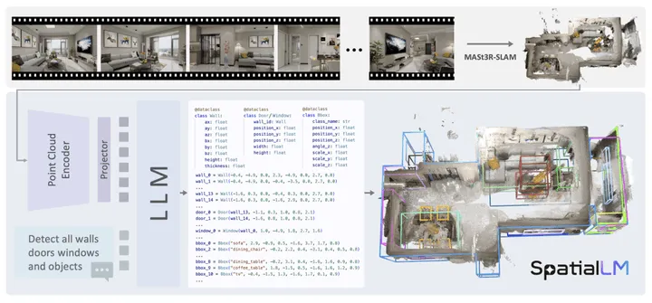 其工作原理如下:给定一个 RGB 视频,首先使用 MASt3R-SLAM 进行三维点云重建,然后利用 SpatialLM 将这些密集点云转化为结构化表示。点云编码器将点云信息编码为紧凑的特征表示,随后由大语言模型(LLM)生成描述场景的场景代码(scene codes),这些场景代码可以被进一步转换为三维结构布局。
