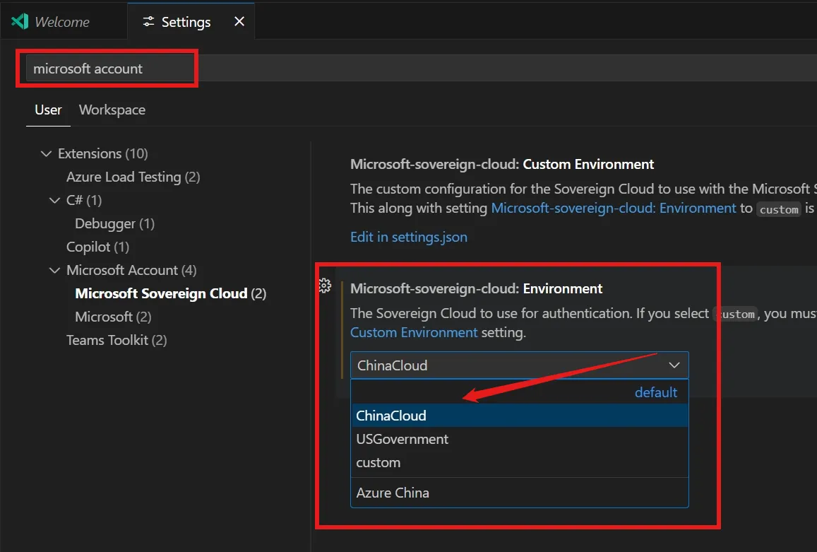 设置 --> 输入“” 关键字过滤 --> 修改Environment 值为ChinaCloud
