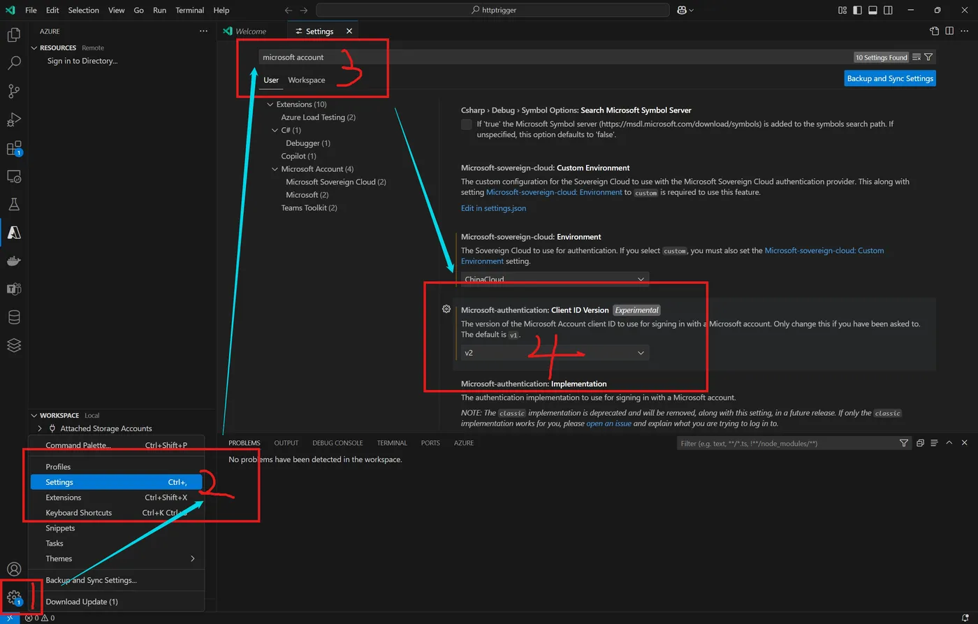 打开VS Code 设置页面 “Setting” ---> 输入 "microsoft account" 过滤配置 ---> 在Microsoft中找到Client ID Version --->修改值为 v2