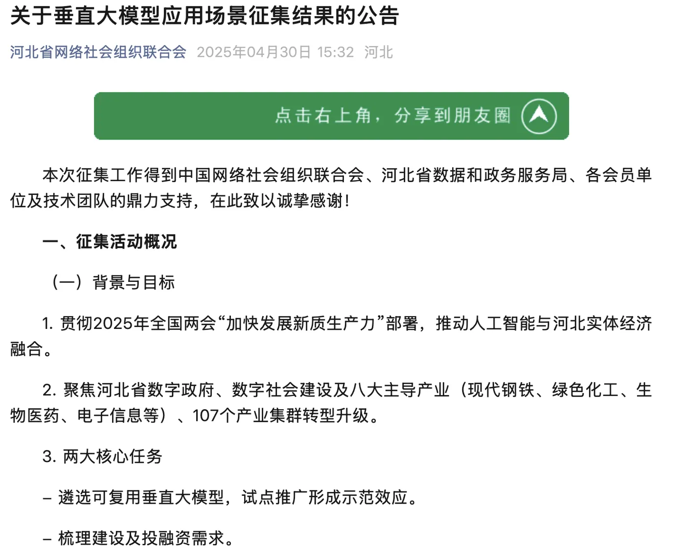 2025年全国两会明确提出“加快发展新质生产力”的战略目标,人工智能与实体经济融合成为关键路径。在此背景下,河北省网络社会组织联合会联合河北省数据和政务服务局发起“垂直大模型应用场景征集”活动,旨在通过遴选技术成熟、可快速复用的垂直大模型解决方案,推动河北省八大主导产业(现代钢铁、绿色化工、生物医药、电子信息等)及107个产业集群的智能化升级。