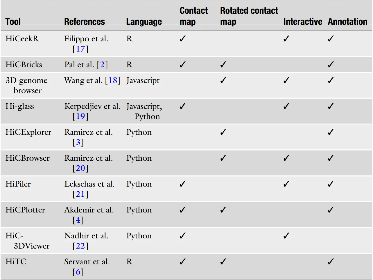 Hi-C 数据是由成对的接触矩阵组成的,这些矩阵记录了基因组位点之间相互作用的概率。基因组位点通常被划分为相邻的、不重叠的基因组窗口,通常称为“bins”,它们汇总了其组成限制性片段的接触频率。随着技术的不断发展,为了提高 Hi-C 数据对最终用户的可解释性,已经开发出多种数据可视化方法。这些方法包括接触矩阵的热图表示、基于弧线的远距离接触表示,以及基于网络图的方法。