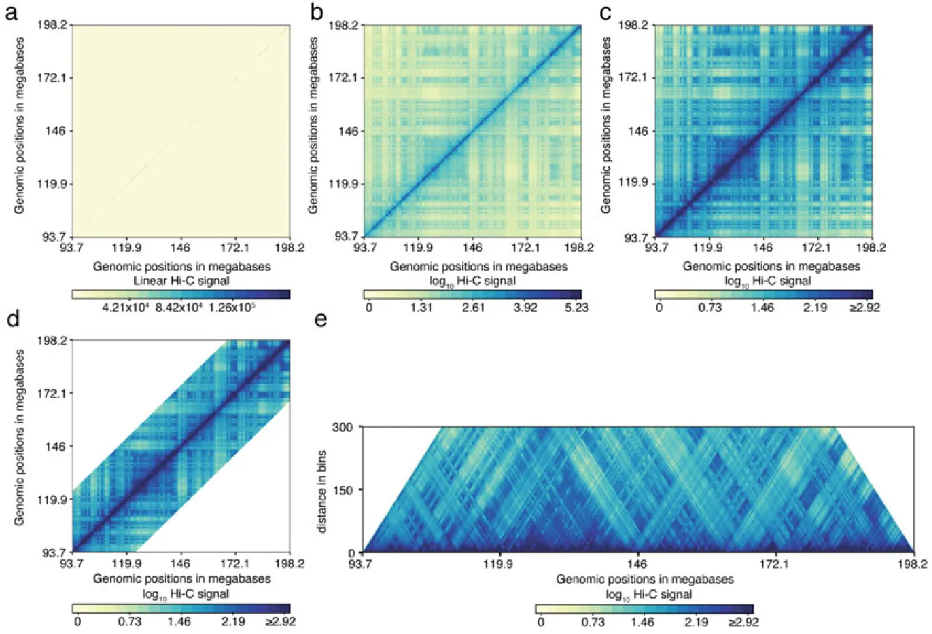 HiCBricks提供两种热图来展示 Hi-C 接触图,一种是标准热图(正方形或长方形,两个轴上都标有基因组位点),另一种是旋转的三角形热图(横轴表示距离,纵轴表示基因组位置)。在 HiCBricks中,所有热图都是通过 Brick_vizart_plot_heatmap 函数生成的。这个函数基于 ggplot2,ggplot2 是一个在数据可视化领域广泛使用的 R 包。