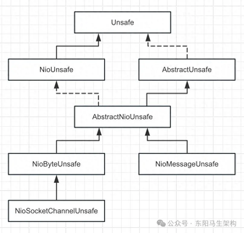 一个Channel对应一个Unsafe,Unsafe用于处理底层IO操作。NioServerSocketChannel对应NioMessageUnsafe,NioSocketChannel对应NioByteUnsafe。