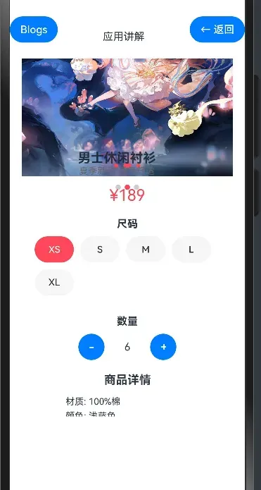 Row组件水平排列减少按钮、数量文本和增加按钮,点击按钮可以调整商品数量。 - 商品详情部分使用