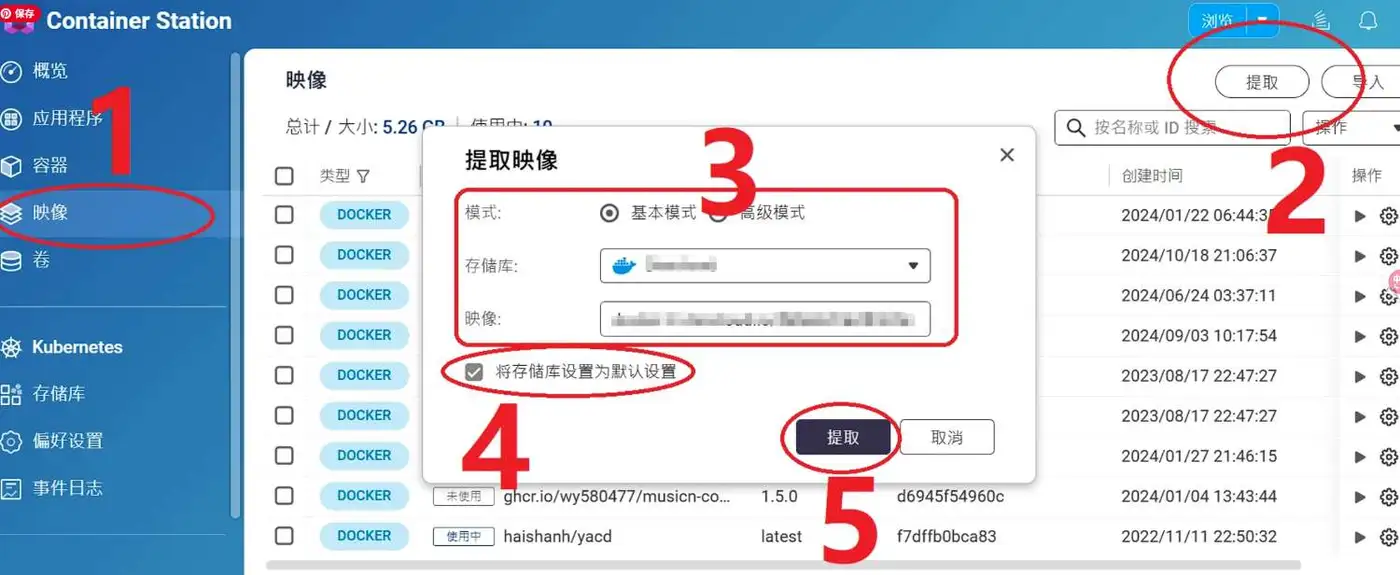 - 1. 在 Container Station 左侧点击 映像,点击右上角 提取 按钮。