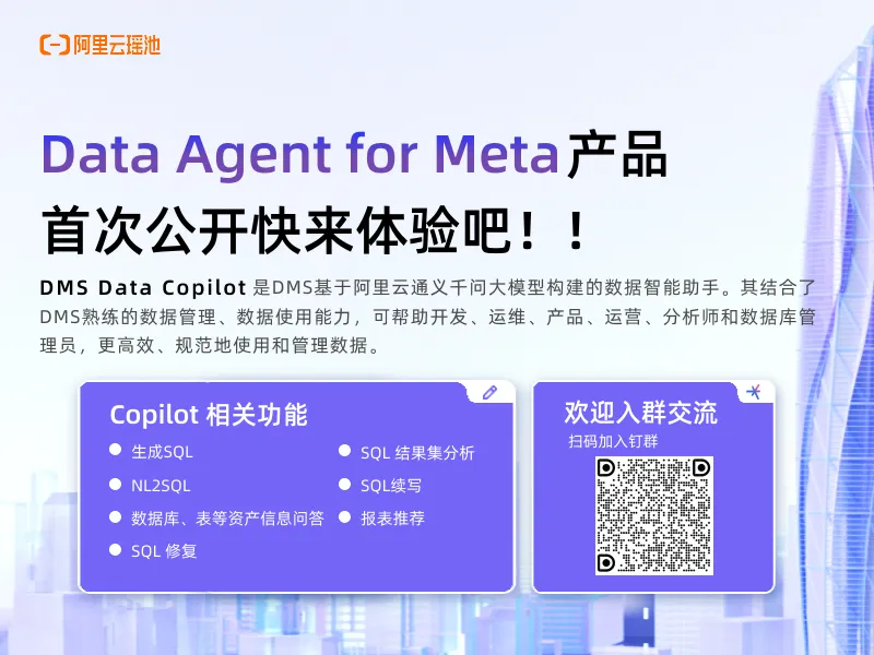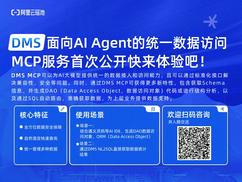本次智能实践开放日发布的“Data+AI”能力家族,代表了数据库工具智能化演进的重要方向。通过统一智能的数据访问层 DMS MCP Server、高效便捷的 DTS AI 数据准备通道以及面向核心场景的 Data Agent 系列智能体,阿里云瑶池数据库构建了一套覆盖数据全生命周期的智能化工具链。