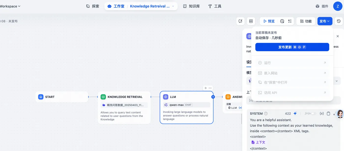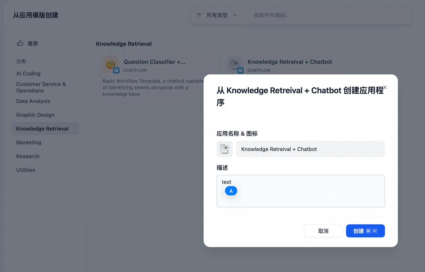 - 在应用模板中创建一个knowledge retreival + chatbot作为基础模板