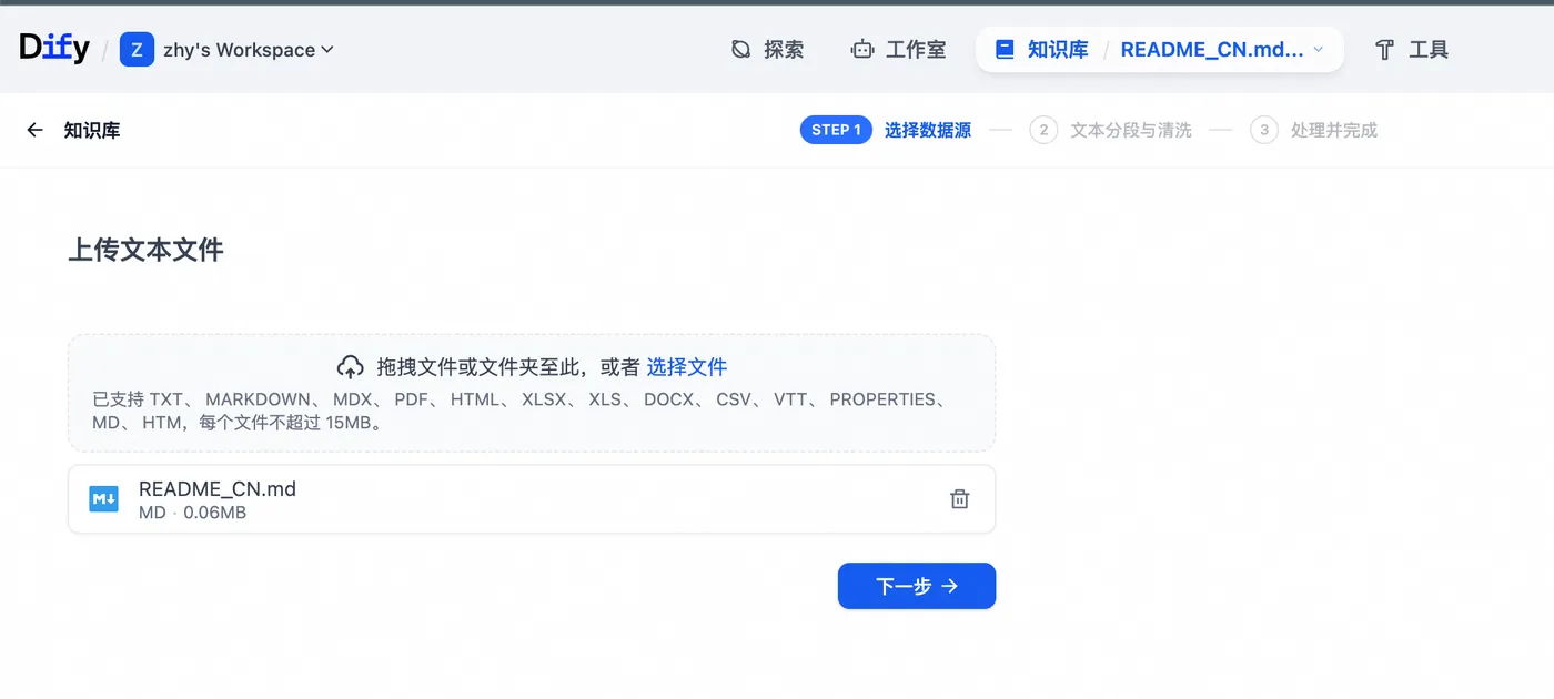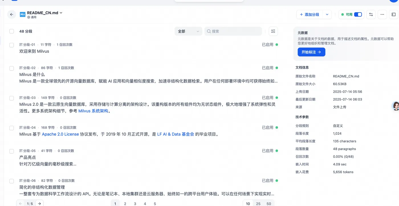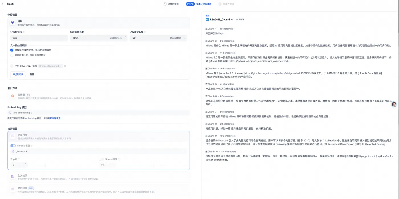 - 在选择数据源处选择“导入已有文本”,可使用milvus官网的中文README作为测试数据源文件