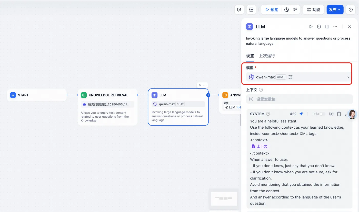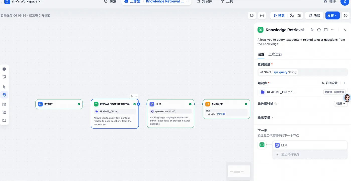 - 修改knowledge retreival节点,设置前步骤的知识库