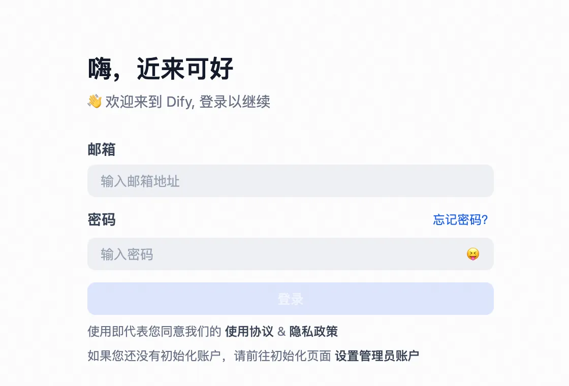 - 启动后访问http://127.0.0.1/ 进入dify的登陆页面,设置管理员账号密码,并登陆进管控台。