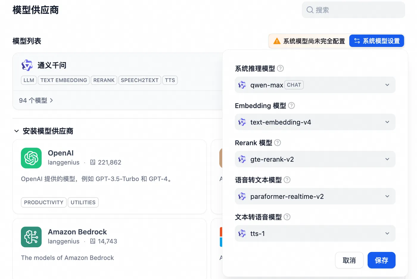 - 系统模型设置:将通义千问对应的模型设置到每种模型处。