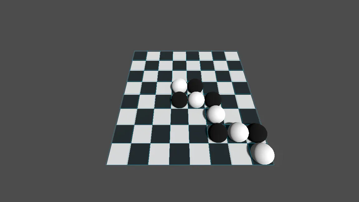 //Main.cs private enum Piece { None, Black, White } private Piece[,] boardState = new Piece[BoardSize, BoardSize]; private Piece currentPlayer = Piece.Black; private void OnCellClicked(Vector2I position) { if (boardState[position.X, position.Y] != Piece.None) return; var toFlip = GetFlippablePieces(position, currentPlayer); if (toFlip.Count == 0) { GD.Print("非法落子!"); return; } // 落子 boardState[position.X, position.Y] = currentPlayer; PlacePiece(position, currentPlayer); // 翻子 foreach (var flipPos in toFlip) { boardState[flipPos.X, flipPos.Y] = currentPlayer; FlipPiece(flipPos, currentPlayer); } // 切换回合 currentPlayer = currentPlayer == Piece.Black ? Piece.White : Piece.Black; } //获取需要翻转的棋子 private List<Vector2I> GetFlippablePieces(Vector2I pos, Piece player) { List<Vector2I> totalToFlip = new(); Piece opponent = (player == Piece.Black) ? Piece.White : Piece.Black; foreach (var dir in Directions) { List<Vector2I> toFlip = new(); int x = pos.X + dir.X; int y = pos.Y + dir.Y; while (x >= 0 && x < BoardSize && y >= 0 && y < BoardSize) { var p = boardState[x, y]; if (p == opponent) { toFlip.Add(new Vector2I(x, y)); } else if (p == player) { if (toFlip.Count > 0) { totalToFlip.AddRange(toFlip); } break; } else // None { break; } x += dir.X; y += dir.Y; } } return totalToFlip; } /// <summary> /// 放置棋子 /// </summary> /// <param name="pos"></param> /// <param name="piece"></param> private void PlacePiece(Vector2I pos, Piece piece) { var ball = ballScene.Instantiate<Node3D>(); ball.Position = new Vector3(pos.X, 0.2f, pos.Y); var mesh = ball.GetNode<MeshInstance3D>("MeshInstance3D"); var mat = new StandardMaterial3D(); mat.AlbedoColor = (piece == Piece.Black) ? new Color(0, 0, 0) : new Color(1, 1, 1); mesh.MaterialOverride = mat; ball.Name = $"Piece_{pos.X}_{pos.Y}"; boardNode.AddChild(ball); } /// <summary> /// 翻转棋子 /// </summary> /// <param name="pos"></param> /// <param name="toColor"></param> private void FlipPiece(Vector2I pos, Piece toColor) { string nodeName = $"Piece_{pos.X}_{pos.Y}"; if (boardNode.HasNode(nodeName)) { var piece = boardNode.GetNodeOrNull<Ball>(nodeName); var mesh = piece.GetNode<MeshInstance3D>("MeshInstance3D"); var mat = new StandardMaterial3D(); mat.AlbedoColor = (toColor == Piece.Black) ? new Color(0, 0, 0) : new Color(1, 1, 1); mesh.MaterialOverride = mat; piece.FlipTo(currentPlayer == Piece.Black ? Colors.Black : Colors.White); } }