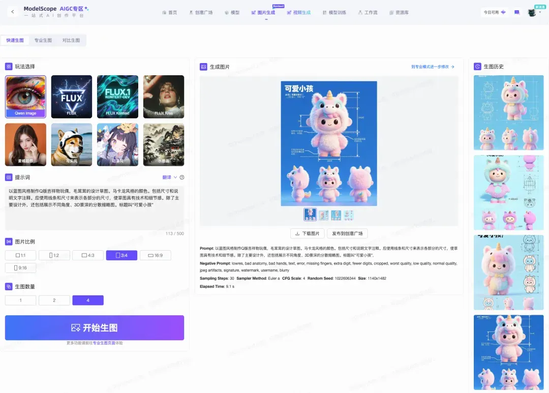 魔搭社区提供了快速生图 和 专业生图两种模型推理体验方式。