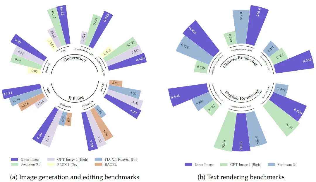 Qwen-Image在多个公开基准上对Qwen-Image进行了全面评估,包括用于通用图像生成的GenEval、DPG和OneIG-Bench,以及用于图像编辑的GEdit、ImgEdit和GSO。Qwen-Image在所有基准测试中均取得了最先进的性能,展现出其在图像生成与图像编辑方面的强大能力。此外,在用于文本渲染的LongText-Bench、ChineseWord和TextCraft上的结果表明,Qwen-Image在文本渲染方面表现尤为出色,特别是在中文文本渲染上,大幅领先现有的最先进模型。这凸显了Qwen-Image作为先进图像生成模型的独特地位,兼具广泛的通用能力与卓越的文本渲染精度。