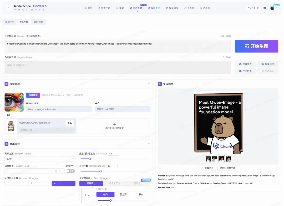 目前Qwen-Image已经是魔搭AIGC专区快速生图的的默认模型: