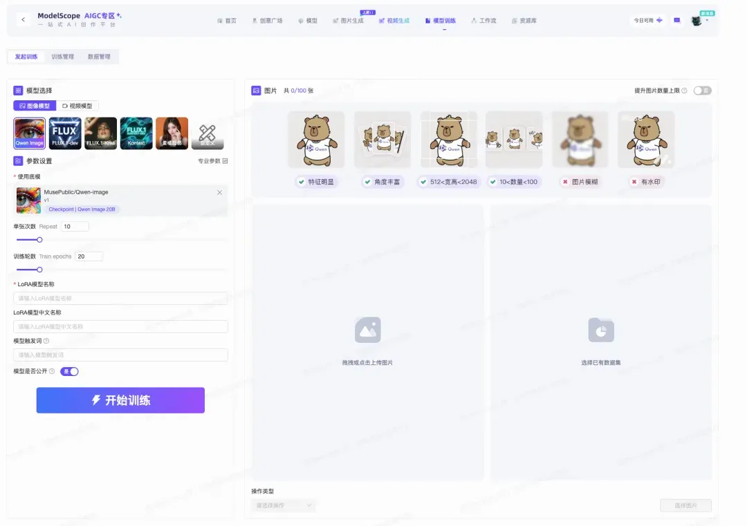 通过这一功能,可以在线创建出反映个人风格的独特LoRA模型。无论是打造专属的特色风格,还是实现特定场景的渲染效果,模型训练功能都能成为你的得力助手。