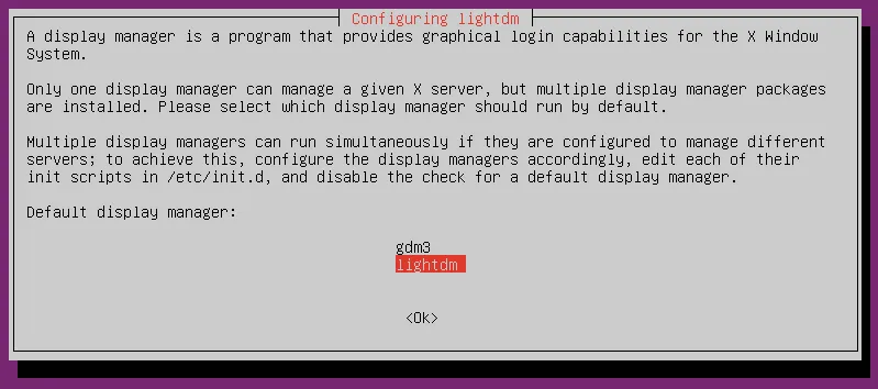 选择列表中的 “lightdm” 并点击 “<Ok>”。这应该用不了几分钟。完成后你可以用下面的命令启动显示管理器并加载 GUI: