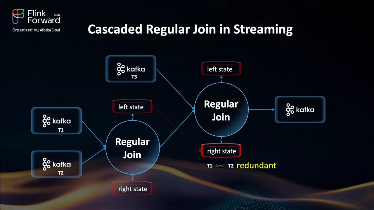 Flink 的 Regular Join 是一个二元操作:一次只能连接两条流。如果我们想关联 T1、T2 和 T3 三张表,系统必须构建一个级联式执行计划:先将 T1 与 T2 关联,再将结果与 T3 关联。