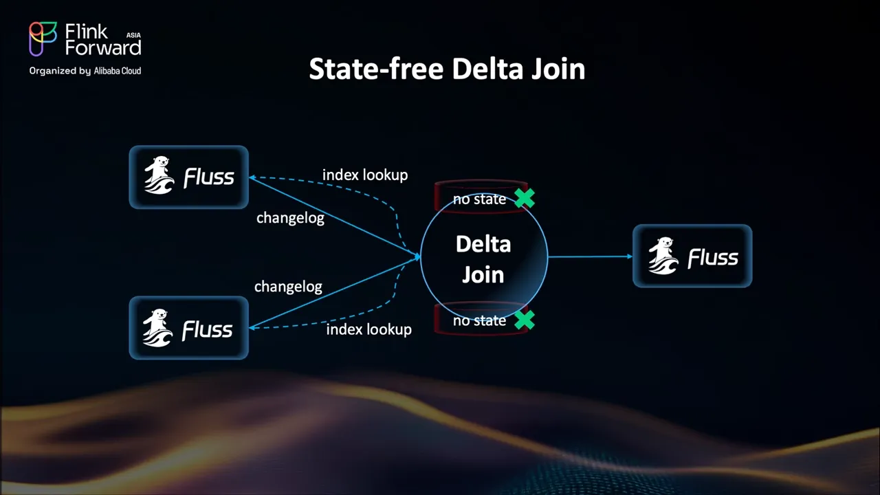 这就是 Delta Join 的用武之地——它带来了一种截然不同的设计思路。与传统 Join 方式将所有数据缓存在 Flink 状态后端不同,Delta Join 转而依赖外部存储系统(例如基于 RocksDB 构建的 Apache Fluss),将数据存于外部,实现真正的无状态计算。