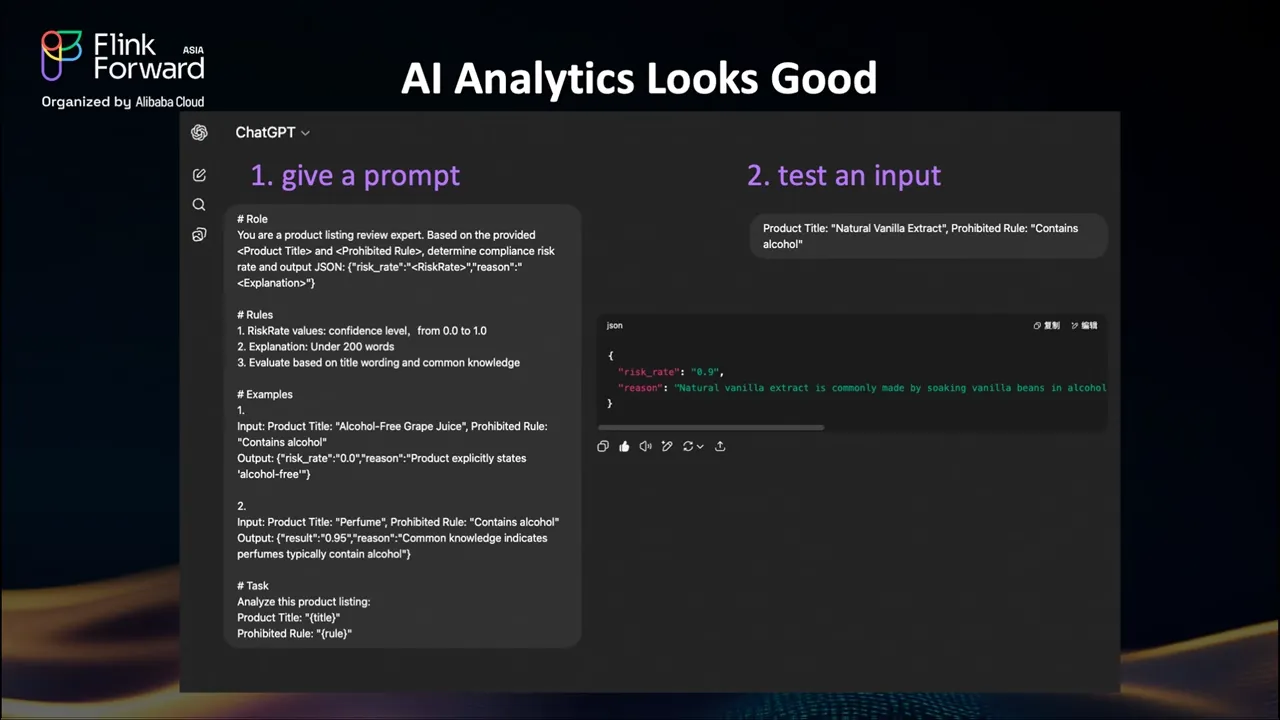 让我们通过一个具体的示例将所有内容整合在一起。以下是 Flink AI 函数如何解决我们的产品合规性挑战: