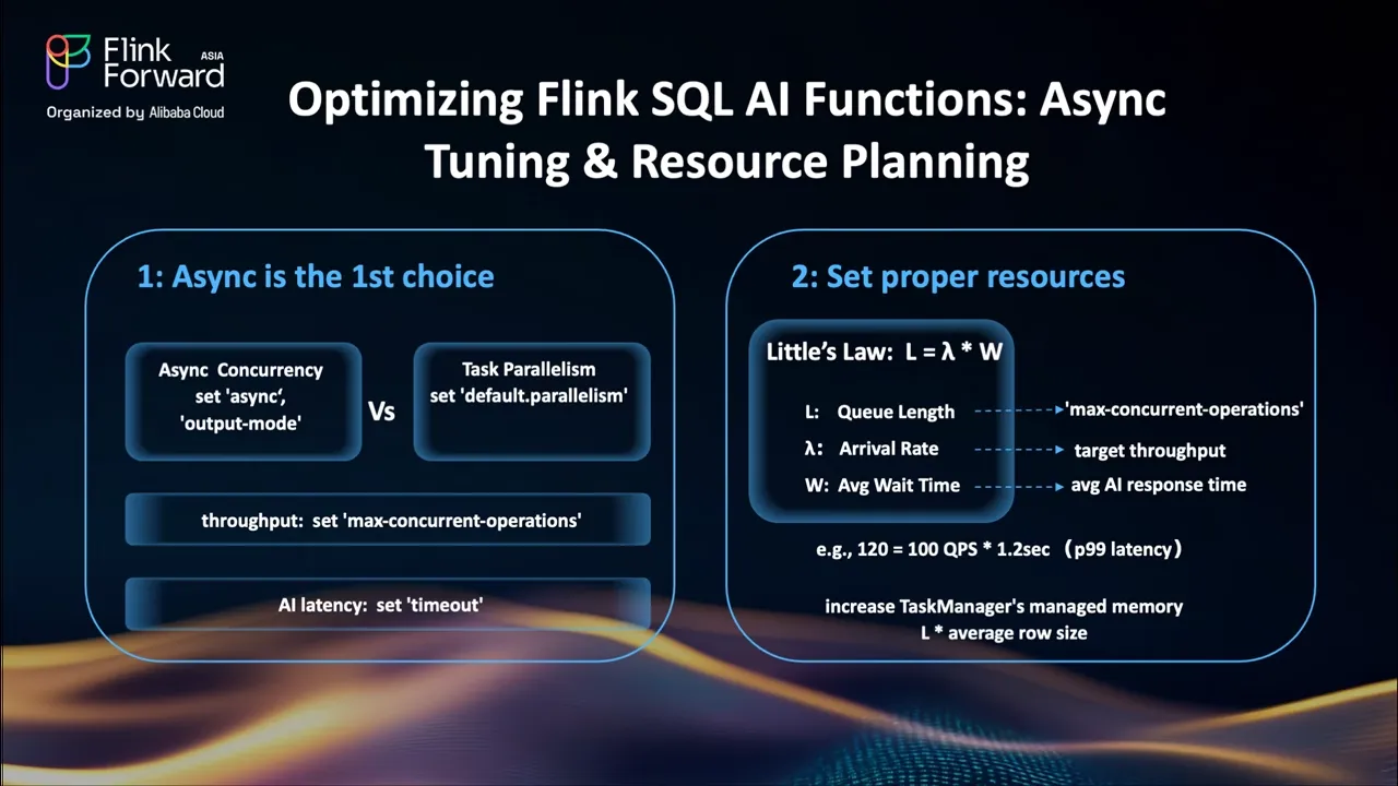 ML_PREDICT()调用中启用异步执行可以是首选。与增加任务并行度相比,这更具成本效益。对于仅追加的流,使用allow_unordered output_mode,这样Flink可以处理得更快。设置max-concurrent-operations以匹配您的 LLM 容量。如果您不想触发任务失败,可以将异步超时参数设置得比 AI 的最大延迟更大。有关异步操作的更多详细信息,请参考Flink文档。基于 Little 定律进行资源规划:应用此公式进行容量规划: