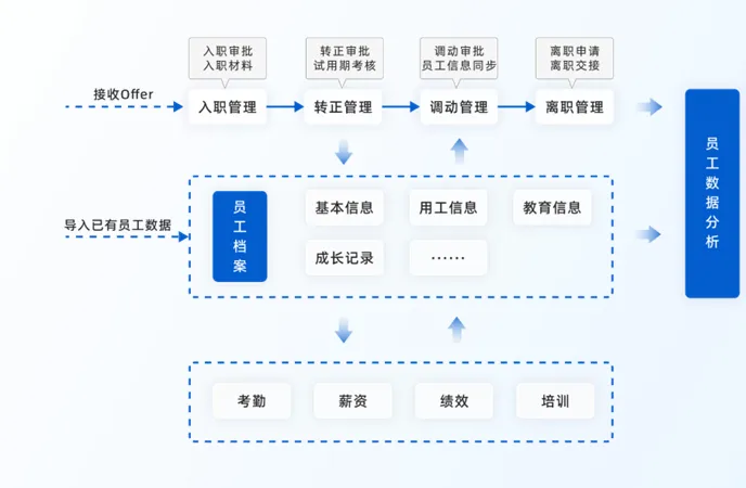 人事管理系统(HRMS)是一套用于管理企业员工全生命周期的数字化平台,涵盖但不限于岗位管理、招聘管理、入职管理、绩效考核、培训管理、薪资福利等子系统。