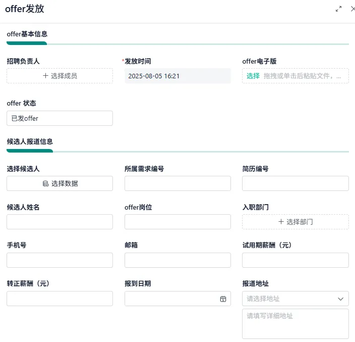 - 功能:生成 Offer 文档(Word/PDF),通过系统或邮件发送给候选人。