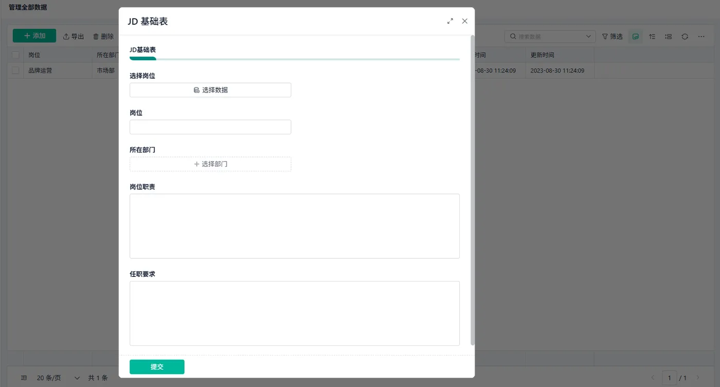 - 功能:维护职位描述模板,包括岗位职责、任职要求、薪资范围等。