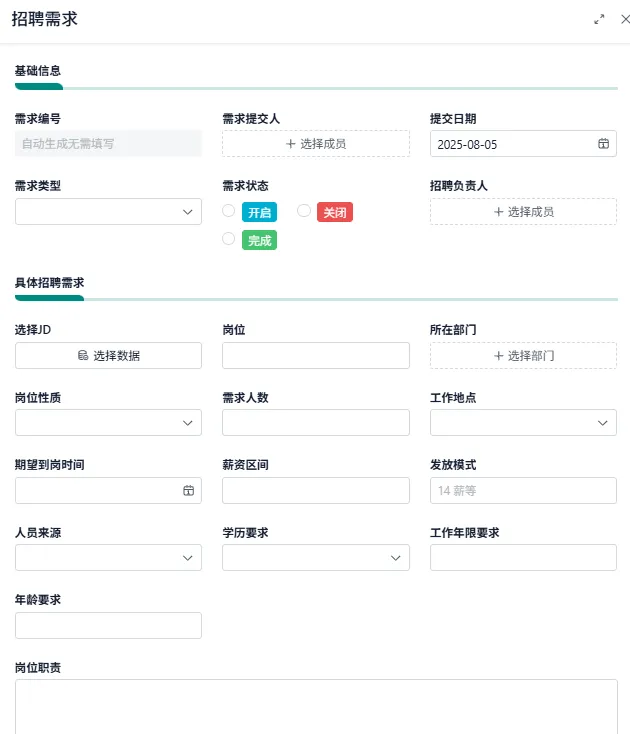 - 功能:用人部门提交招聘需求,关联 JD 模板,填写人数、预算、预计 timeline,并触发审批。