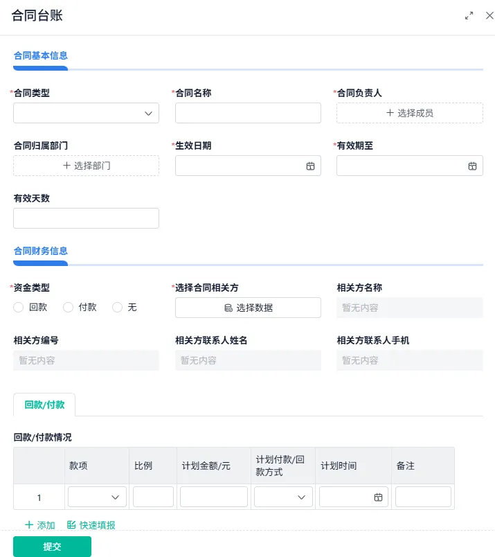 - 合同信息录入: 用户登录系统后,在“合同台账”模块中选择“新增合同”,填写合同的基本信息,如合同编号、合同双方、合同金额、签署日期等。