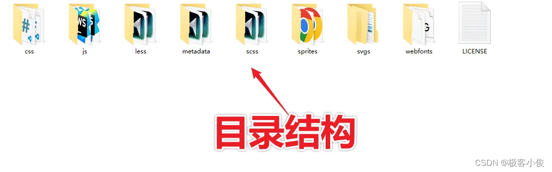 当我们下载好了Font Awesome之后,我们就把它解压一下,得到以下目录结构: