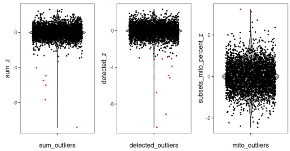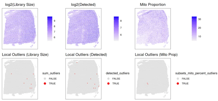 随后,我们可以通过 spot 图(spot plots)对这些 QC 指标进行可视化,以直观确认检测到的局部异常值确实为异常。为此,我们将把输出的 log2 转换数据(或未经转换的线粒体比例)与检测到的局部异常值并置展示。