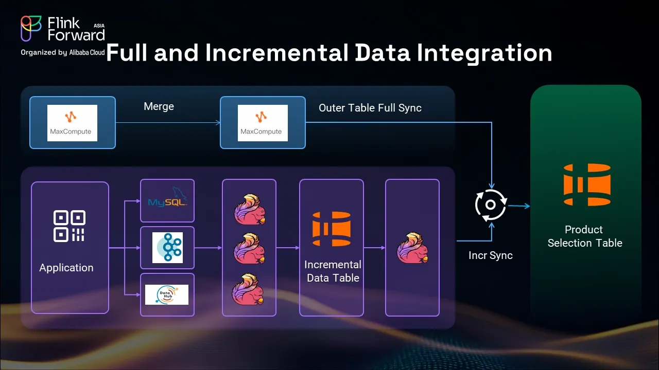 增量数据处理涉及多个数据源,包括 MySQL、Kafka 和来自 MaxCompute 的每小时数据更新。我们使用 Flink 将这些数据同步到 Hologres 中的一个中间增量数据表,该表作为不同数据源的汇聚点。