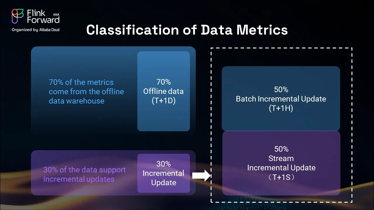 我们的分析显示,电商平台上约 70% 的指标来自离线批处理数据仓库操作,通常具有 T+1D(次日)的延迟。其余 30% 由需要更及时更新的增量数据构成,我们进一步将其分为两个不同的数据流。