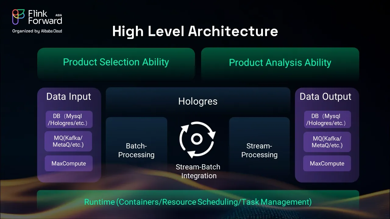 我们的解决方案以阿里云实时计算 Flink 和 Hologres 为核心组件,构建了一个支持实时流处理与批处理能力的统一架构。该架构通过成熟的容器化和资源调度系统提供运行时可用性,并具备复杂的任务管理能力。