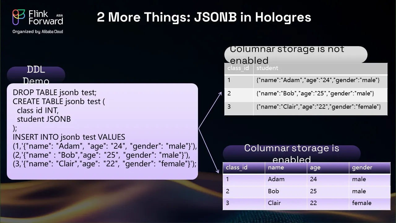 Hologres 的 JSON-B 支持为我们提供了所需的灵活性,它在列式存储的同时,允许根据具体需求在存储模式之间切换。当不需要列式存储时,我们使用标准存储模式;而当分析查询需要列式访问时,我们可以轻松切换到优化的列式存储。