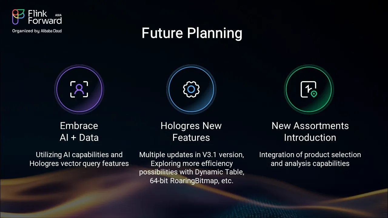 我们的 AI 驱动选品系统能够基于活动主题和历史表现数据,从数十亿可用商品中推荐最具潜力的 SKU。这一能力利用了 Hologres 的向量查询功能,以及即将推出的 64 位 Roaring Bitmap 支持,这将实现更复杂的标签管理和 AI 生成的商品理解。