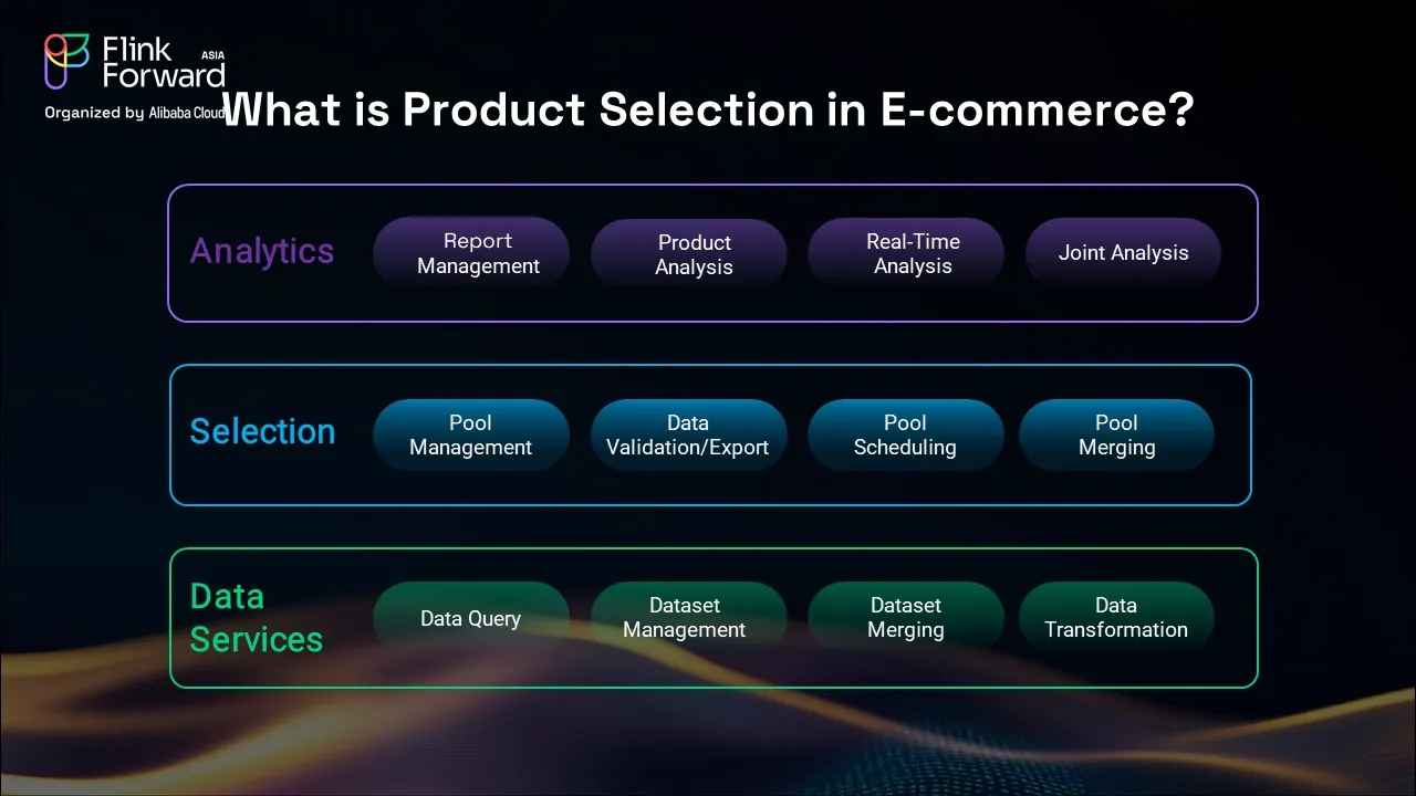 商品选品流程包含三个关键层级。最底层是数据服务层,为所有商品相关信息提供基础设施支持。在其之上是选品层,SKU 被分组进入不同池中,并根据业务需求进行处理。最上层是分析层,使业务智能团队能够进行实时分析并做出数据驱动的决策。