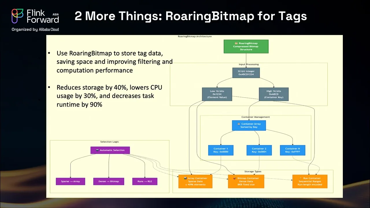 我们的团队研究并实现了 Roaring Bitmap 技术,该技术使用 32 位整数并将其拆分为低 16 位和高 16 位,从而高效压缩标签数据。系统使用三种数据容器:稀疏数据使用数组容器,高密度数据使用位图容器,连续范围使用 run 容器。