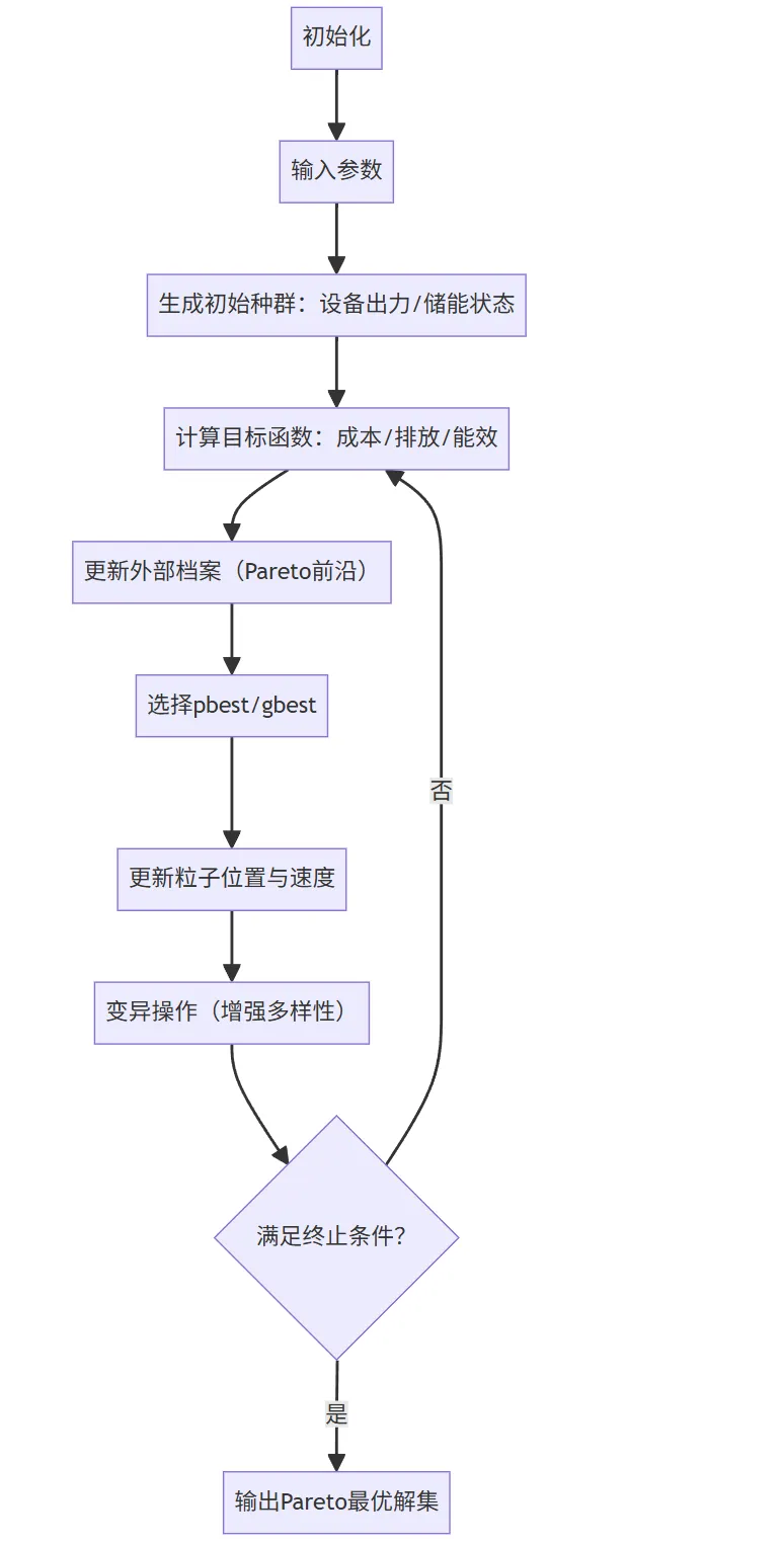 MOPSO算法通过并行搜索Pareto解集,有效协调CCHP系统中能效、经济、环保目标的冲突,其收敛速度与约束处理能力尤为适合多能源耦合优化。未来需进一步融合不确定性建模与多能流协同,推动CCHP系统向低碳智慧能源枢纽演进。