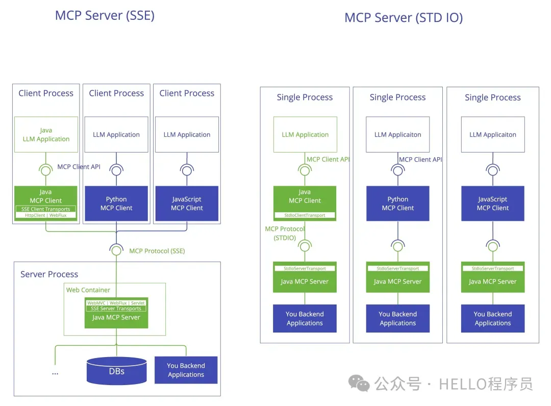 除了这些核心功能,MCP 客户端还支持一些额外特性,比如根管理、采样控制,以及同步或异步操作。为了适应不同场景,它提供了多种数据传输方式,包括标准输入/输出、基于 Java HttpClient 和 WebFlux 的 SSE 传输。