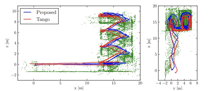 r = [Ar*sin(tspan), Ar*cos(tspan), 0.5*tspan.^2]),加入高斯噪声(加速度计噪声0.1*randn(N,3),陀螺仪噪声(randn(N,3)*2 + ones(N,3))/180*pi)。 - 对比基准:与Google Tango等现成系统及传统滤波/优化算法对比,验证预积分方法的精度与效率。