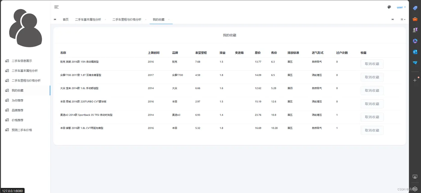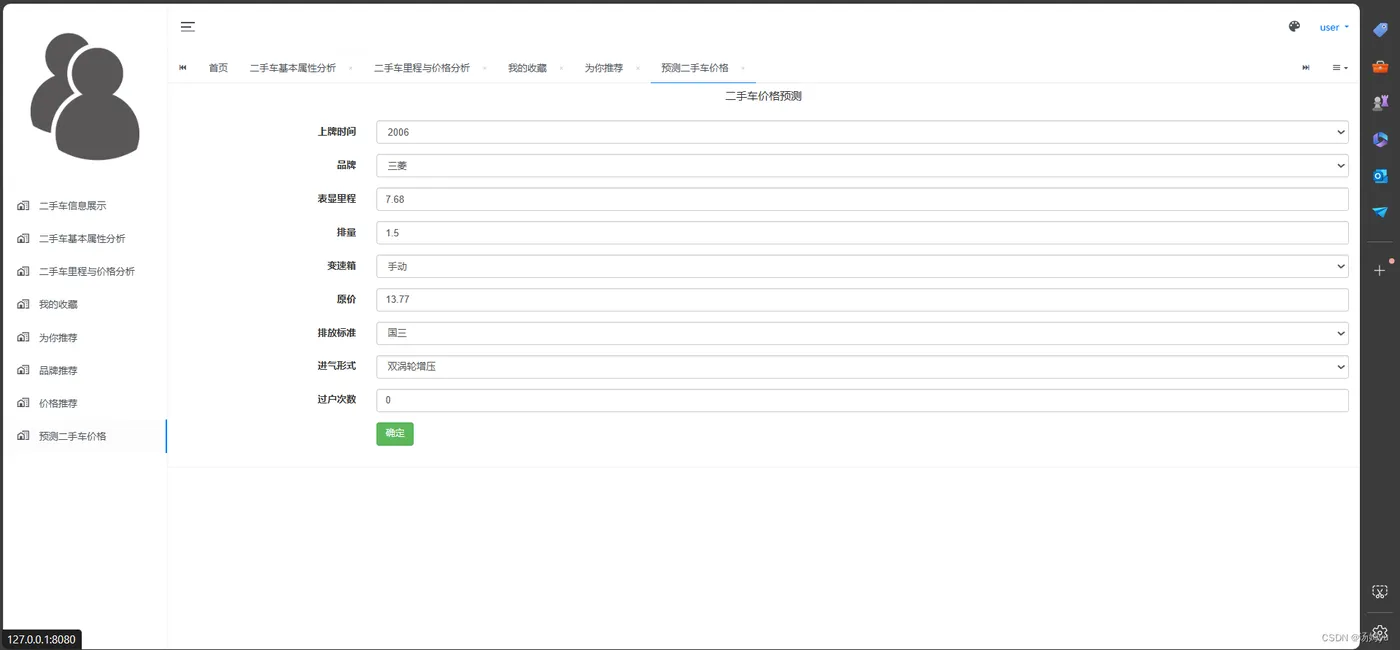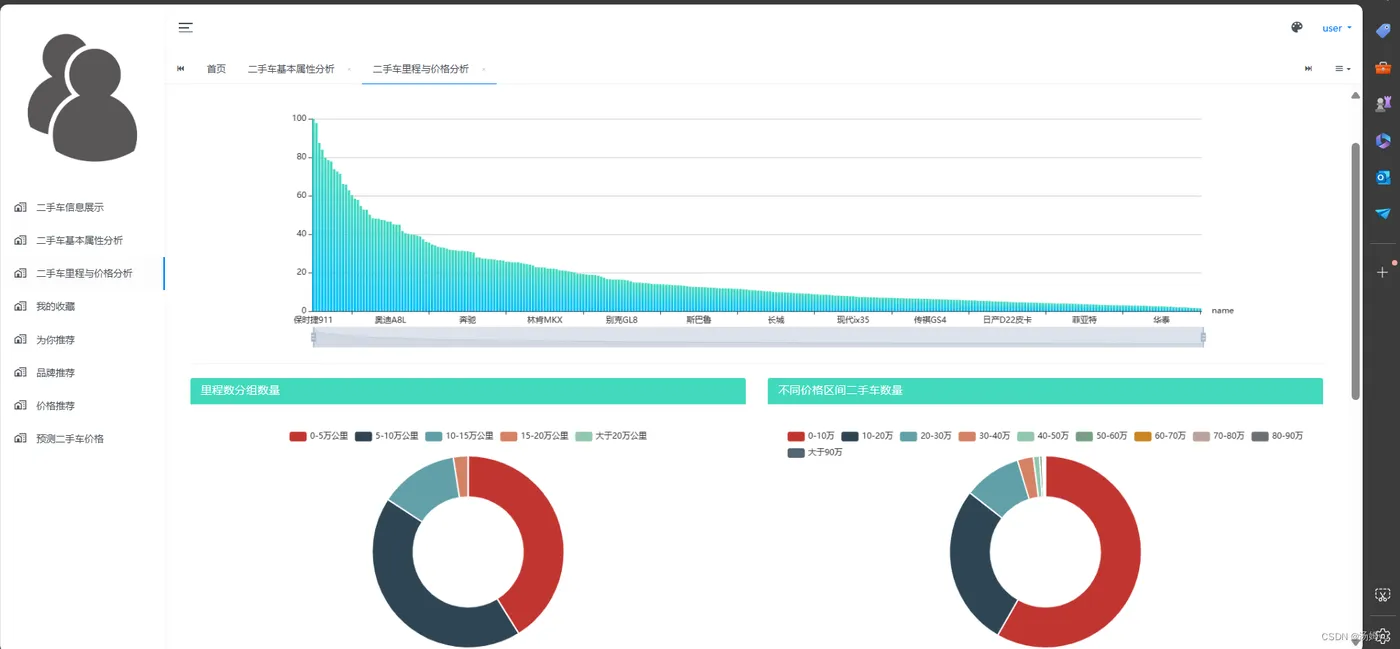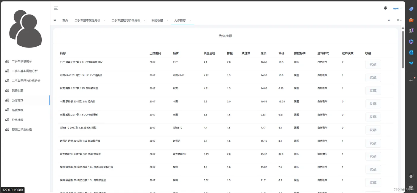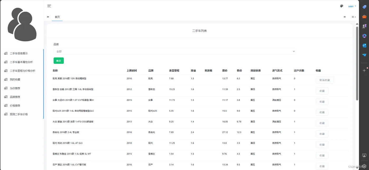 汽车数据可视化、推荐及预测系统的研究具有重要的理论和实践意义,对于汽车行业的发展和用户体验的提升具有深远影响,这一研究方向有助于深入挖掘汽车大数据的潜在价值。随着智能汽车和互联汽车技术的普及,汽车制造商和服务提供商积累了大量与汽车相关的数据,包括车辆性能数据、用户行为数据、交通环境数据等。通过数据可视化、推荐及预测系统的研究,可以更好地分析和利用这些数据,挖掘出对汽车设计、生产和服务改进具有指导意义的信息,为汽车行业的发展提供新的思路和方法,研究汽车数据可视化、推荐及预测系统有助于提升用户体验和满足用户个性化需求。通过对用户行为数据和偏好的分析,结合推荐算法和预测模型,可以为用户提供个性化的汽车产品推荐和购车建议,提高用户选车的准确性和满意度。同时,基于对汽车数据的可视化展示,用户可以更直观地了解汽车的性能、特点和优缺点,从而更好地进行购车决策,提升购车体验,研究汽车数据可视化、推荐及预测系统对汽车行业的经营决策和市场营销策略具有重要的指导意义。通过对市场趋势和用户行为的分析,汽车制造商和经销商可以制定更精准的产品定位、定价和促销策略,提高市场竞争力和盈利能力。同时,汽车数据可视化也可以为消费者提供更加透明和真实的汽车信息,增强汽车行业的信誉和可持续发展。