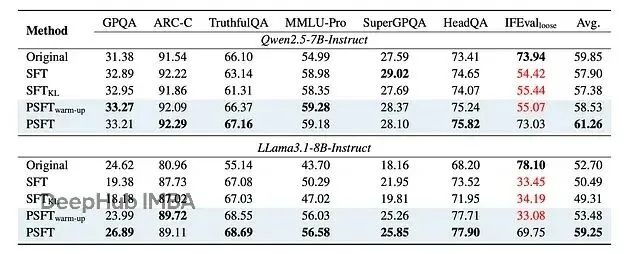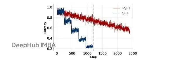 这个设计很巧妙:通过比较新旧策略的概率比值并进行裁剪,PSFT 能够防止模型参数更新过于激进。这样既能学习新任务,又能保持原有的通用能力,同时避免熵坍塌。