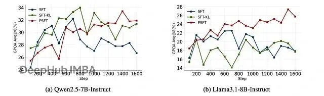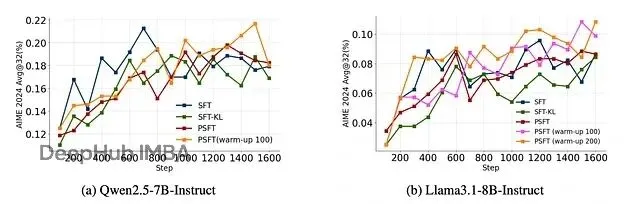 首先是熵的变化。PSFT 能够维持更平滑的熵曲线,避免了传统 SFT 中的熵坍塌现象: