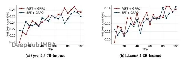 PSFT 的优势不只体现在数学推理上,在模型对齐方面也有帮助。用 DPO 进行对齐训练时,PSFT 预训练的模型表现更稳定: