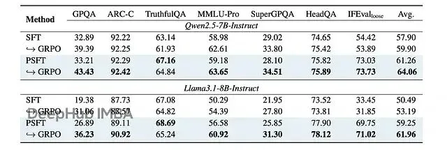 更重要的是域外性能。PSFT 训练的模型在非数学任务上也表现很好,说明它确实提高了泛化能力: