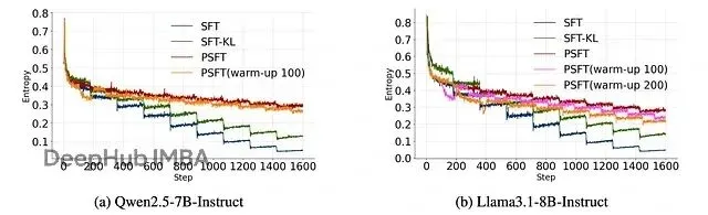 显示两个大语言模型在训练期间熵的图。SFT-KL 是一种应用 KL 惩罚以保持微调模型更接近预训练模型分布的方法。PSFT (warm-up) 是一种在切换到 PSFT 之前开始短暂的初始 SFT 阶段的方法,用于训练稳定性。