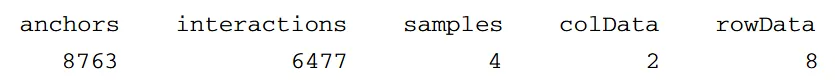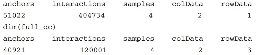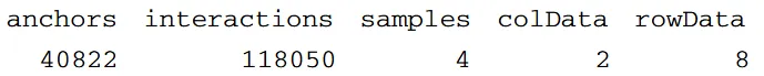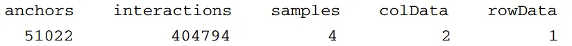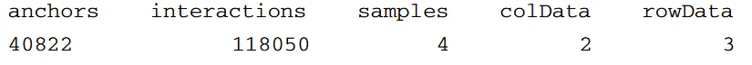由于我们有两套不同的 ChIP-Seq 峰值,锚点(anchors)在处理组与未处理组中是分别定义的。为了得到一份唯一的锚点区域清单,loops- Make.mango 函数还会把邻近的锚点合并(默认 gap 值为 500 bp)。用 dim 函数可以概览生成的 “loop” 对象(full),它包含 5 个不同的槽(slots):存储唯一环锚基因组位置信息的 full@anchors(返回所有坐标的汇总视图)、记录已读入的所有样本间相互作用总数的 full@interactions(打印所有相互作用)、保存所有样本名称及分组信息的 full@colData、记录每个样本中支持各相互作用的读对数的 full@counts,以及最后记录环宽度的 full@rowData。