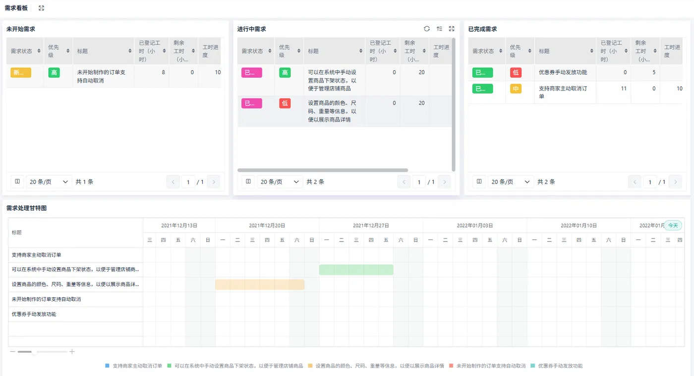 - 需求看板(Kanban):快速可视化每个需求所处阶段(例如:待评估、待排期、开发中、测试中、已上线、已关闭)。